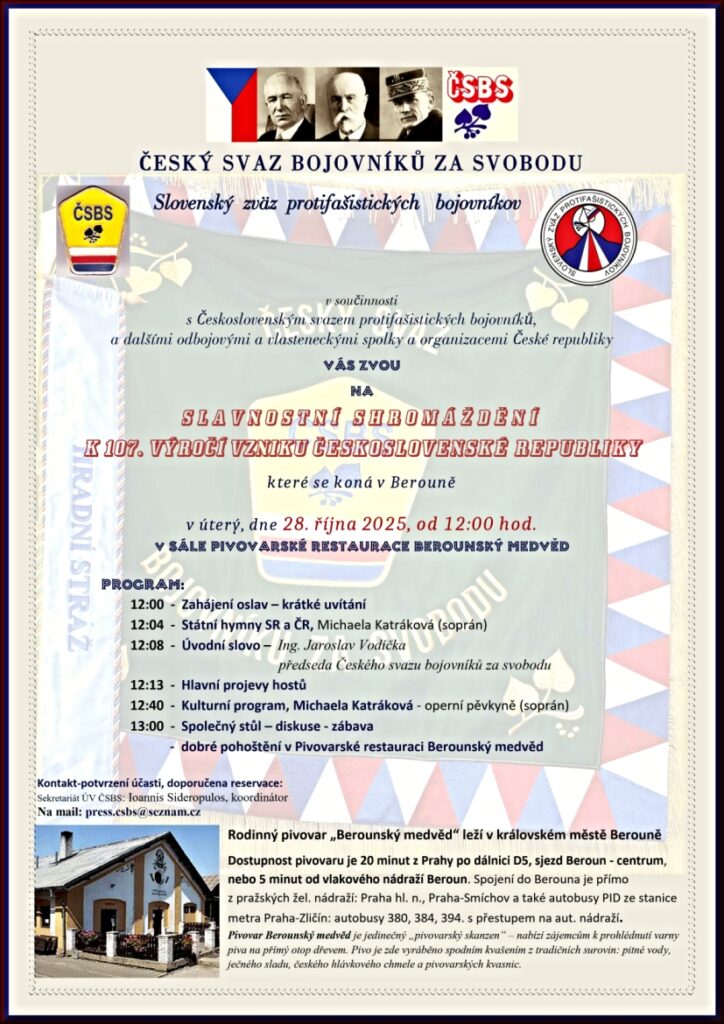 Oslavy založení ČSR 28.10. 2025, ve 12:00 v Berouně, pořádáme vlastenecké setkání s diskusí a kulturním programem. Česko-Slovenské setkání se stává tradicí u příležitosti oslav vzniku Československé republiky v berounském pivovaru „Berounský medvěd“, které pořádají Český svaz bojovníků za svobodu a Slovenský zväz protifašistických bojovníkov. To vše s dobrým pivem a pohoštěním.