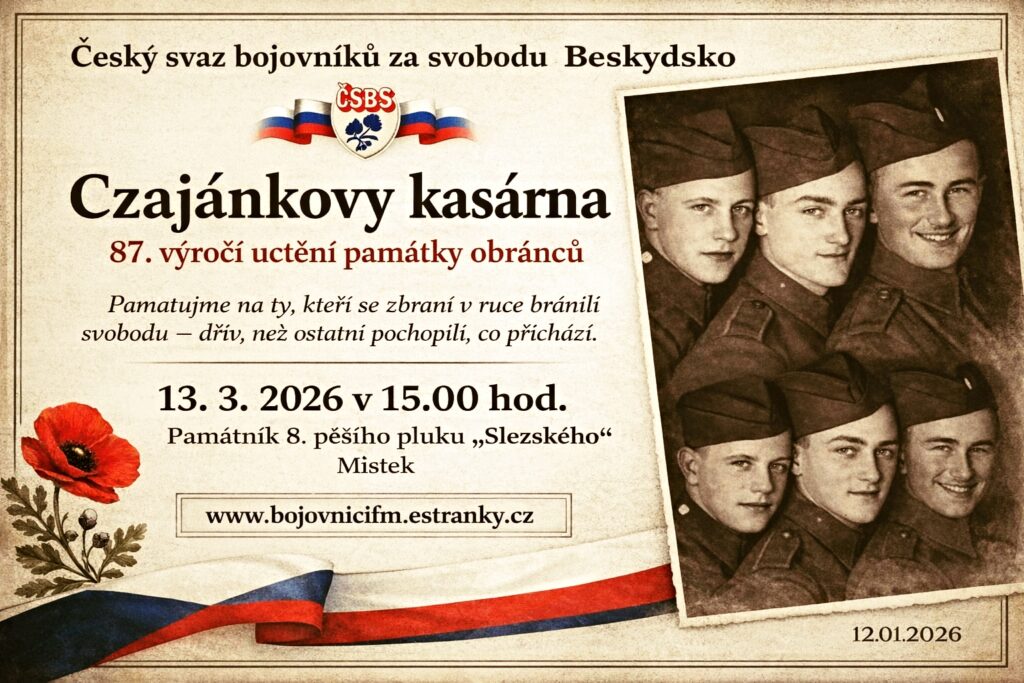 Pozvánka: 87. výročí uctění památky obránců vlasti. Boj o Czajankova kasárna v Místku v březnu 1939 se stal symbolem, který předznamenal protinacistický odboj a boje československé armády v exilu i její znovuzrození na domácím území v letech 1944 a 1945. Zve: Český svaz bojovníků za svobodu Beskydsko