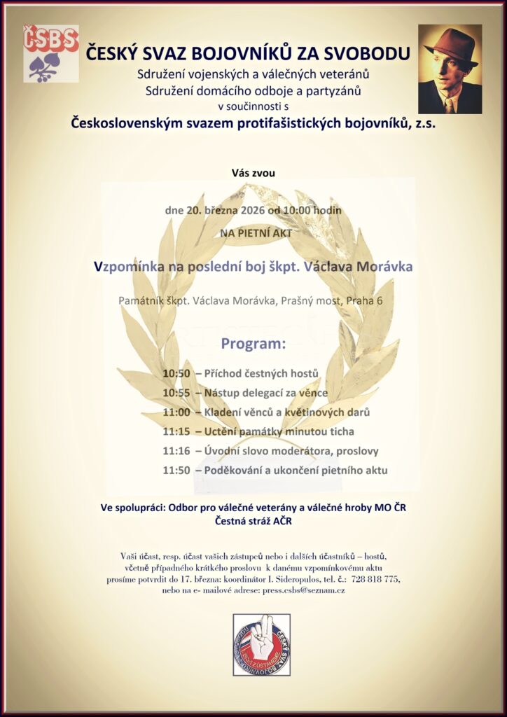 Dovolujeme si vás pozvat na pietní akt – vzpomínku na štábního kapitána Václava Morávka, hrdinu protinacistického odboje.